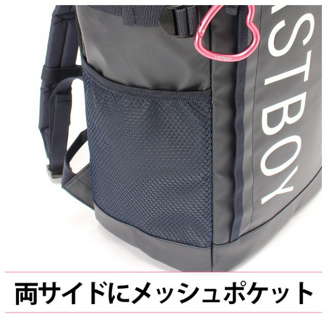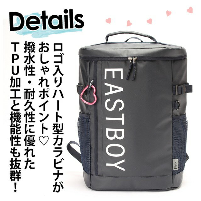 撥水性・耐久性・軽量性に優れたTPU加工が施され、 見た目だけでなく機能性も抜群です! リュックを背負ったまま荷物の出し入れが出来る 便利な背面ファスナー付き! 商品情報 【eby20】EASTBOY(イーストボー)サイトシリーズ スクエアリュック 28L 素 材|ポリエステル(TPU加工) サイズ |約 横33×縦48×マチ18cm 仕 様|両サイドにメッシュポケット 両サイドにコンプレッションベルト付き 右側Dカン付き メインルーム直結背面ファスナー チェストベルト付き 持ちやすいトップハンドル メイン内前面側オープンポケット×2 キーフック付き メイン内背面側吊り下げファスナーポケット クッション材入りポケット ロゴ入りハート型カラビナ付き ショルダーベルト長さ調節可能 対 象|女の子 女子 女児 女性 ガールズ レディース 小学生 中学生 高校生 JS JC JK 大人 社会人 用 途|通学 旅行 修学旅行 普段使い ショッピング 遊び デート お買い物 遠足 部活 クラブ 習い事 レッスン 通塾 通勤 マザーズリュック マザーズバッグ ギフト |誕生日 バースデー クリスマス Xmas 入学祝い 進学祝い ホワイトデー 子供の日 出産祝い イメージ|かわいい おしゃれ 大きい 大きめ 撥水性 軽量性 耐久性 カラビナ付き メッシュポケット 背面ファスナー PC収納 パソコン収納 タブレット収納 ブランド スクールブランド クロ ピンク シロ コン ブラック ホワイト ネイビー チャコールグレー 黒 白 紺 桃 ご注意 ※記載しておりますサイズ・重量は測定方法により若干異なる場合があります。