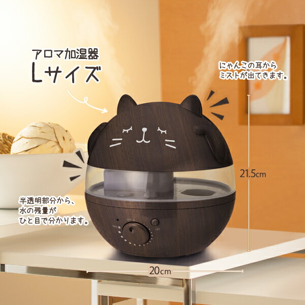 商品名 うるおいにゃんこ アロマ加湿器(L) 2種 サバネコ、ダークウッド サイズ 本体:約 直径20 × 高さ21.5 (cm) コード:1.5m タンク容量 1.7L 加湿 最大加湿量:200ml/h 加湿方式:超音波 電源 電源:AC100V 50/60Hz 消費電力:25W 材質 ABS、AS セット 抗菌カートリッジ、アロマパッド×3枚 備考 ※写真はイメージです。